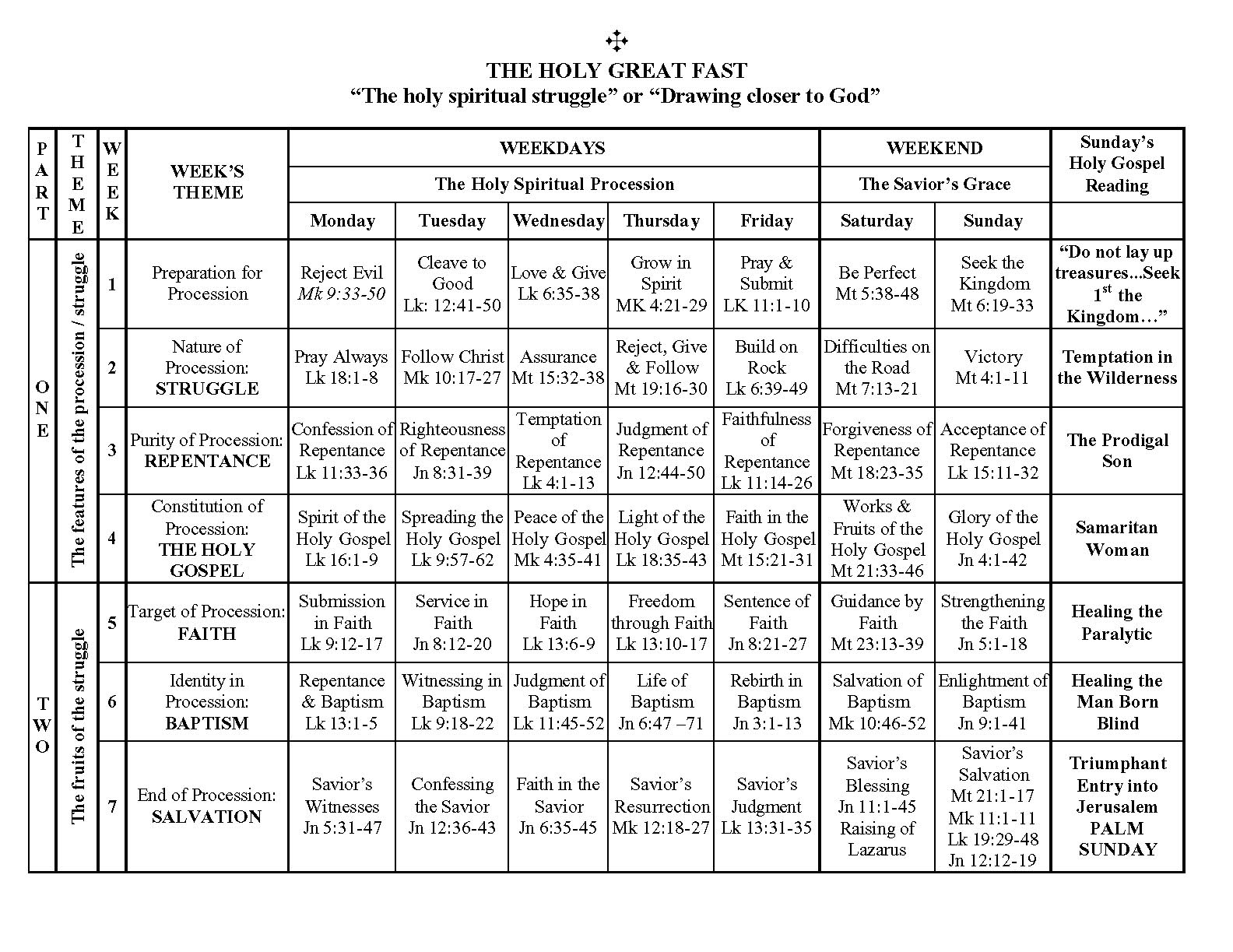 remember the value of fasting during this period. On the surface, we abstain from food, drink, delicacies, and other pleasures; however, this is done to express the love, commitment, and sacrifice we offer up to God who sent His Only-Begotten Son to die for us[2]. In addition to fasting and sacrificing to express our devotion and commitment to God, we take this blessed opportunity to grow spiritually and avoid the sinful distractions that may pull us away from our holy state. This is done by increasing the times we pray and contemplate. To help us do this, the church provides an organized set of themes and Gospel readings for the first forty nine days of the Great Lent for us to follow[4].